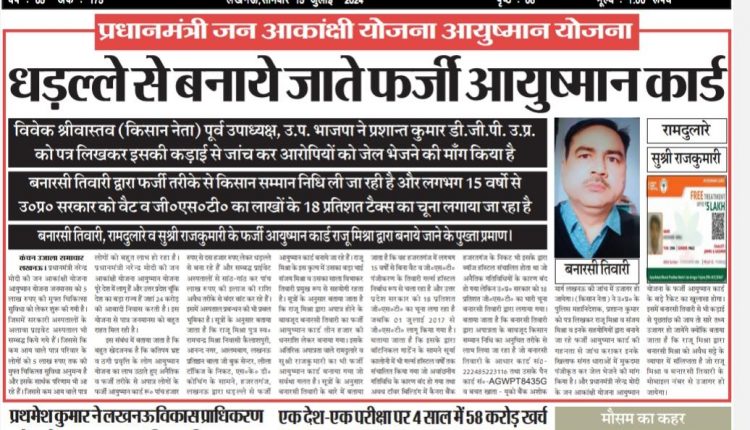 प्रधानमंत्री जन आकांक्षी योजना आयुष्मान योजना विवेक श्रीवास्तव (किसान नेता) पूर्व उपाध्यक्ष, उ.प्र.भाजपा ने प्रशान्त कुमार डी.जी.पी.उ.प्र. को पत्र लिखकर इसकी कड़ाई से जांच कर आरोपियों को जेल भेजने की माँग किया है बनारसी तिवारी, रामदुलारे व सुश्री राजकुमारी के फर्जी आयुष्मान कार्ड राजू मिश्रा द्वारा बनाये जाने के पुख्ता प्रमाण। बनारसी तिवारी द्वारा फर्जी तरीके से किसान सम्मान निधि ली जा रही है और लगभग 15 वर्षो से उ.प्र. सरकार को वैट व जी.एस. टी. का लाखों के 18 प्रतिशत टैक्स का चूना लगाया जा रहा है