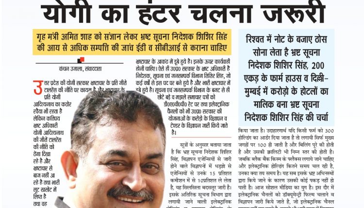 भ्रष्ट सूचना निदेशक शिशिर सिंह के भ्रष्टाचार की चर्चा कई वर्षो से उसके निदेशक पद पर जमे रहने के कारण सत्ता के गलियारों में बनी रहती है। ऐसा भी नहीं है कि भ्रष्ट सूचना निदेशक शिशिर सिंह के नहीं रहने से सूचना विभाग नहीं चल पायेगा या उ.प्र.सरकार की योजनाओं का प्रचार-प्रसार नहीं हो सकेगा। इसके भ्रष्टाचार की जाॅच होने से ही मुख्यमंत्री योगी की जीरो टालरेंस नीति का अनुपालन हो सकेगा। अतः मुख्यमंत्री योगी आदित्यनाथ का हंटर ऐसे भ्रष्टाचारी पर चलना जरूरी है तभी छोटे मझोले पत्रकारों, महिला पत्रकारों को सम्मान मिल सकेगा।